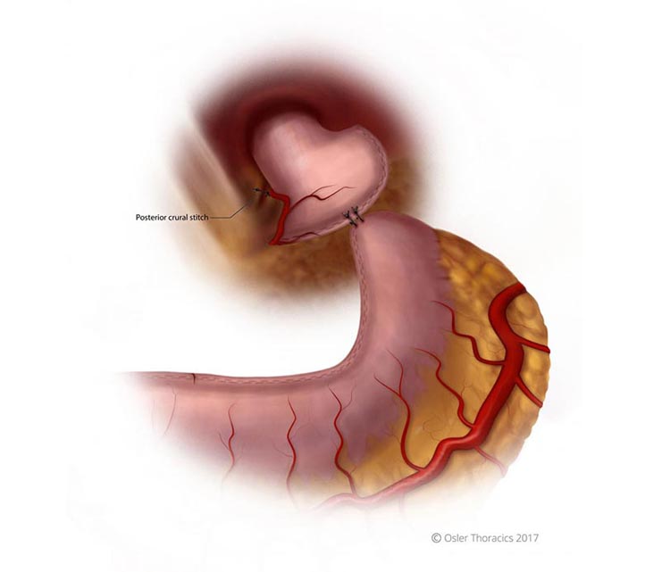 At William Osler Heath System, symptomatic patients with large hiatus hernias are offered a laparoscopic hiatus hernia repair. Performed electively, and at an experienced center, a laparoscopic hiatus hernia repair is safe with excellent long-term symptom control.