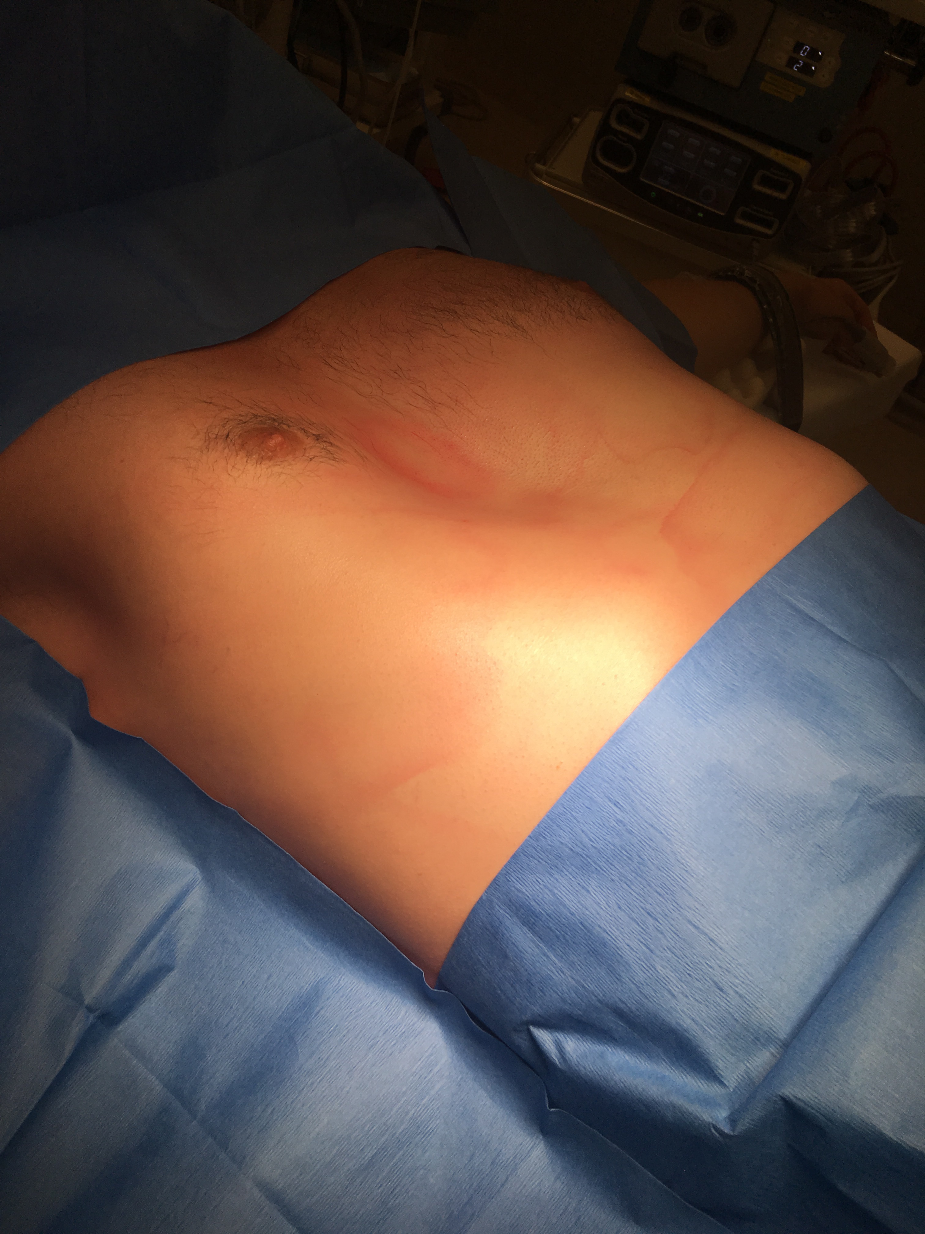 Make the incisions as described above. Use cautery and blunt dissection to create a pocket between the skin and the chest wall. If the plan is to use two bars ensure that your pockets are wider. The incisions are carried down to the chest wall.
