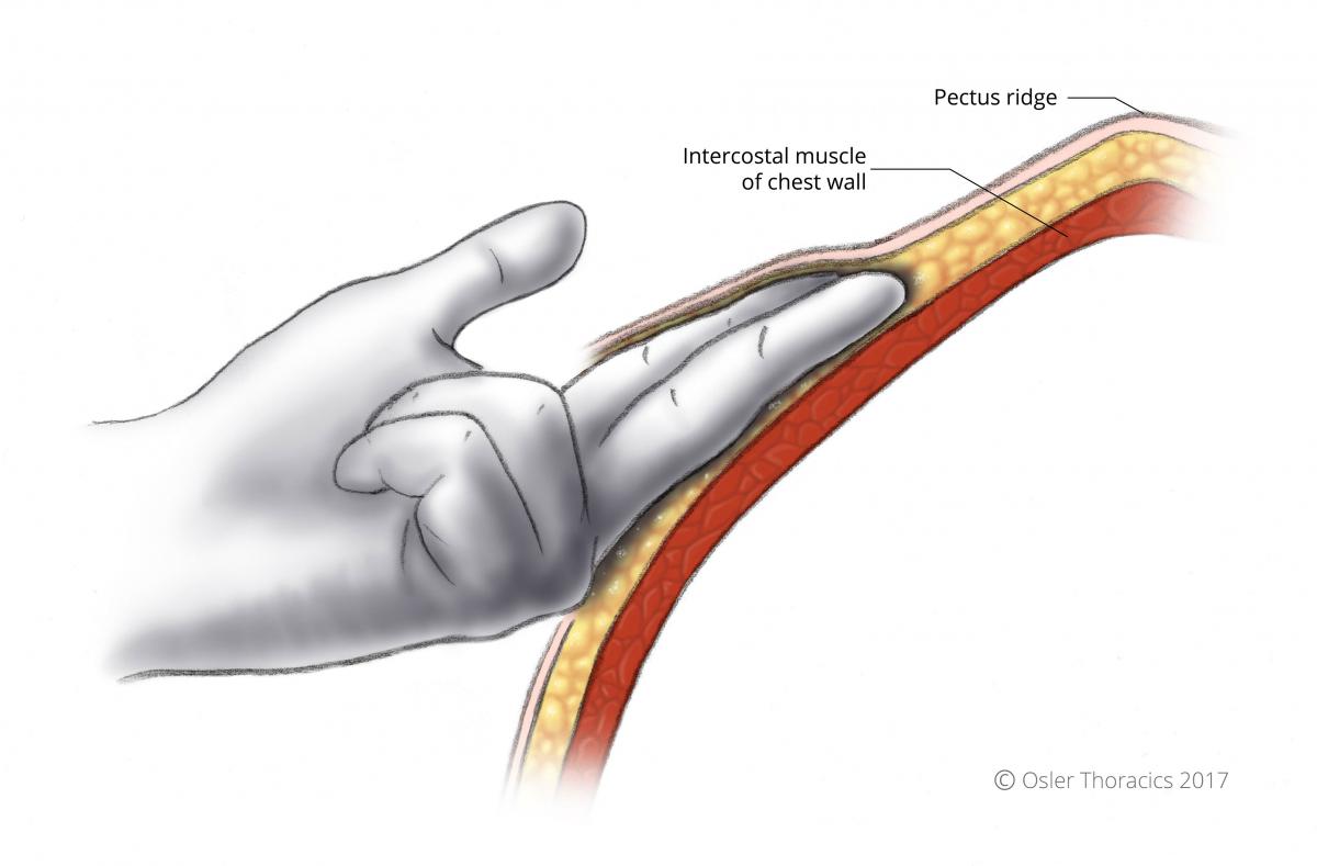 Using your index finger extend your pockets medially up to the pectus ridge. This is the spot where the bar should enter/exit the pleural space