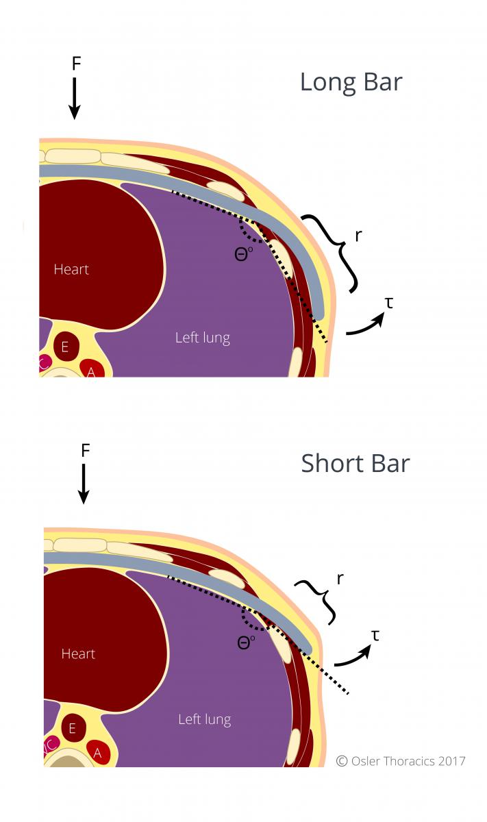 We have recently begun using much shorter bars in our adult population. Torque is a measure of how much a force acting on the bar causes the bar to rotate. If the bar is short, the angle of the extremities is more obtuse. A shorter Nuss bar is thus characterized by a shorter arm and therefore smaller torque acting on its sutures, leading to increased bar stability.