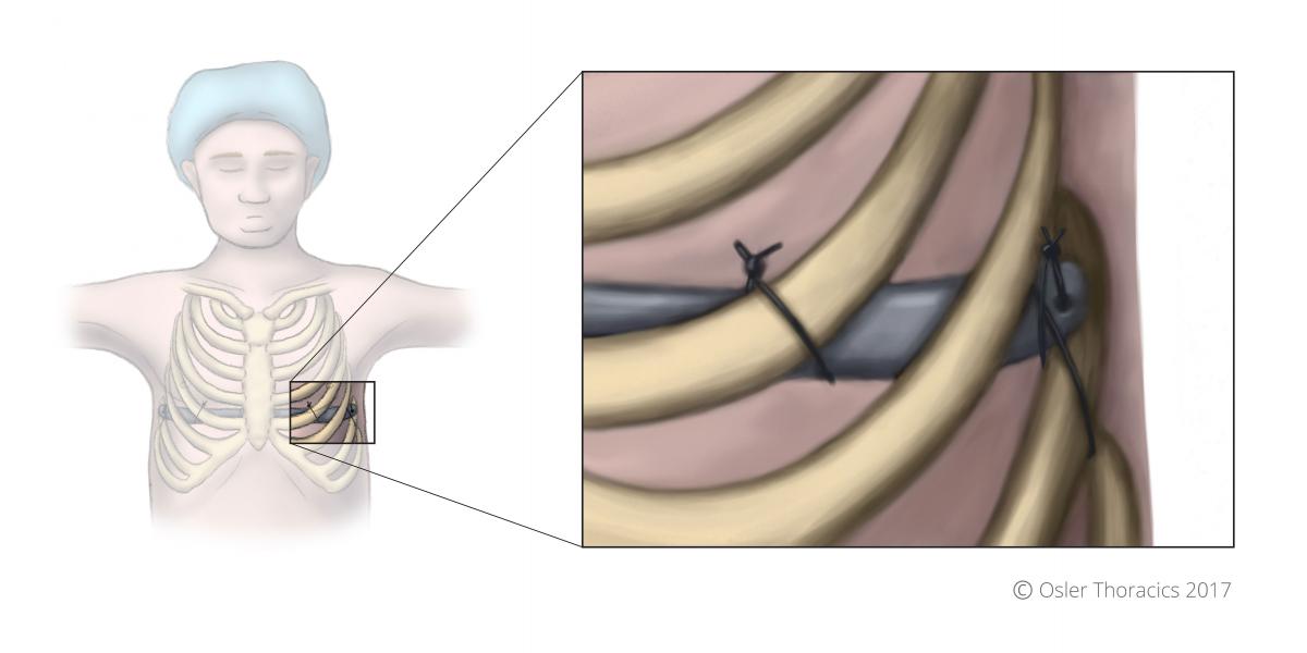 At Osler, we use FiberWire® to perform a bilateral Nuss bar rib fixation. FiberWire® is an extremely strong suture made by Arthrex™, most commonly used by orthopedic surgeons to repair tendons in joints. The FiberWire® suture is constructed of a multi-strand, long chain ultra-high molecular weight polyethylene core with a braided jacket of polyester that gives FiberWire® outstanding strength.